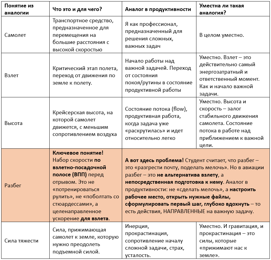 «Самолету нужен разбег по ВПП для взлета → Мне нужна целевая подготовка к важной задаче → Поэтому я должен сразу начать с важной задачи, но предварительно настроившись на нее»