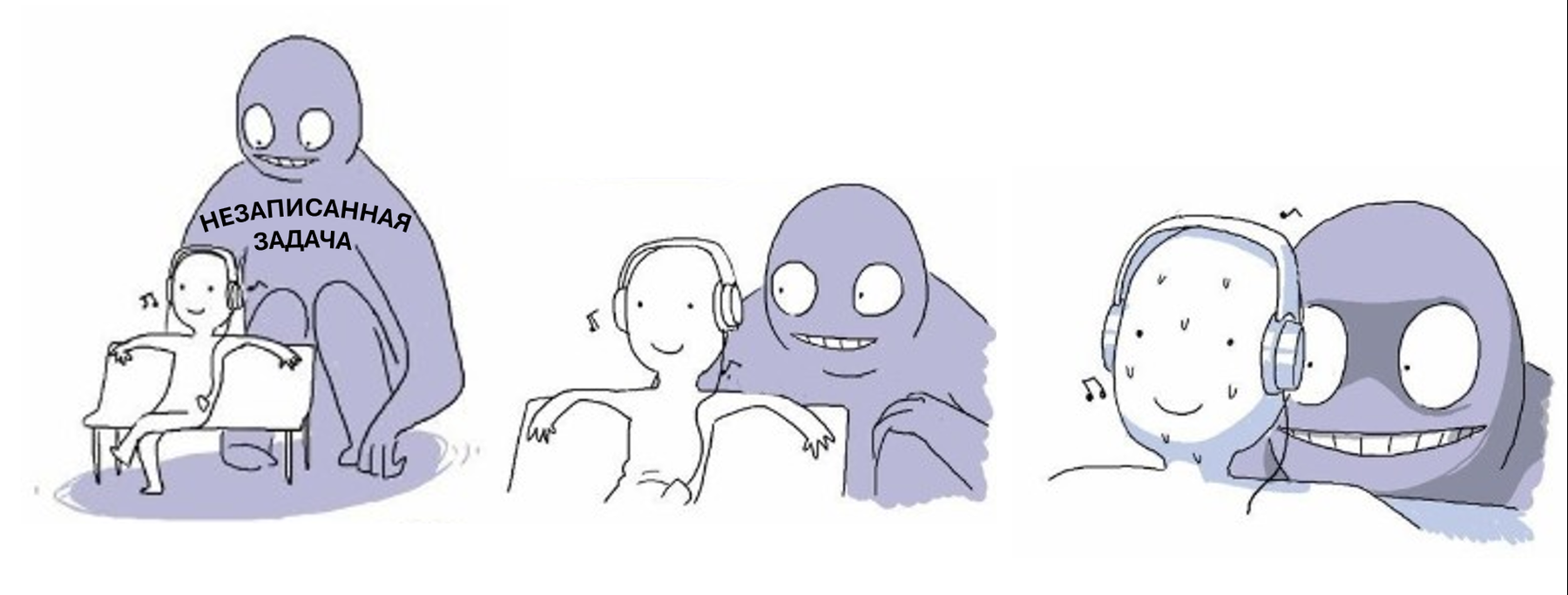 Да... Часто мы боимся записывать задачу в список потому что "ну их же там и так дофига". Хорошо. Не записали. Задач меньше не стало, просто теперь ты не понимаешь, какая их часть не записана и скоро (обязательно) "выпрыгнет" на тебя из-за угла.
