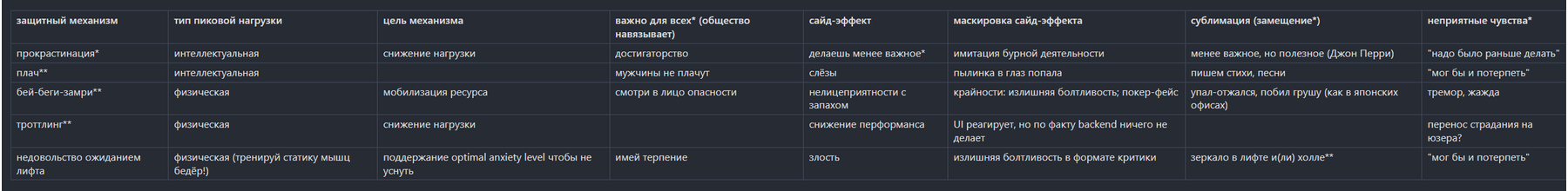 То есть корень, как будто ещё глубже —прокрастинация, как пожарная команда, защищает от изменений, пытается сохранить состояние вечно подзаебанного, никогда не выспавшегося на 100% человека. Который в таком состоянии точно и по карьере не двинется, и в спорте не достигнет ничего, и в друних областях прнципиально ничего не седалет. Ну а вдруг попробую и не получится. Или ещё страшнее — А ВДРУГ ПОЛУЧИТСЯ?