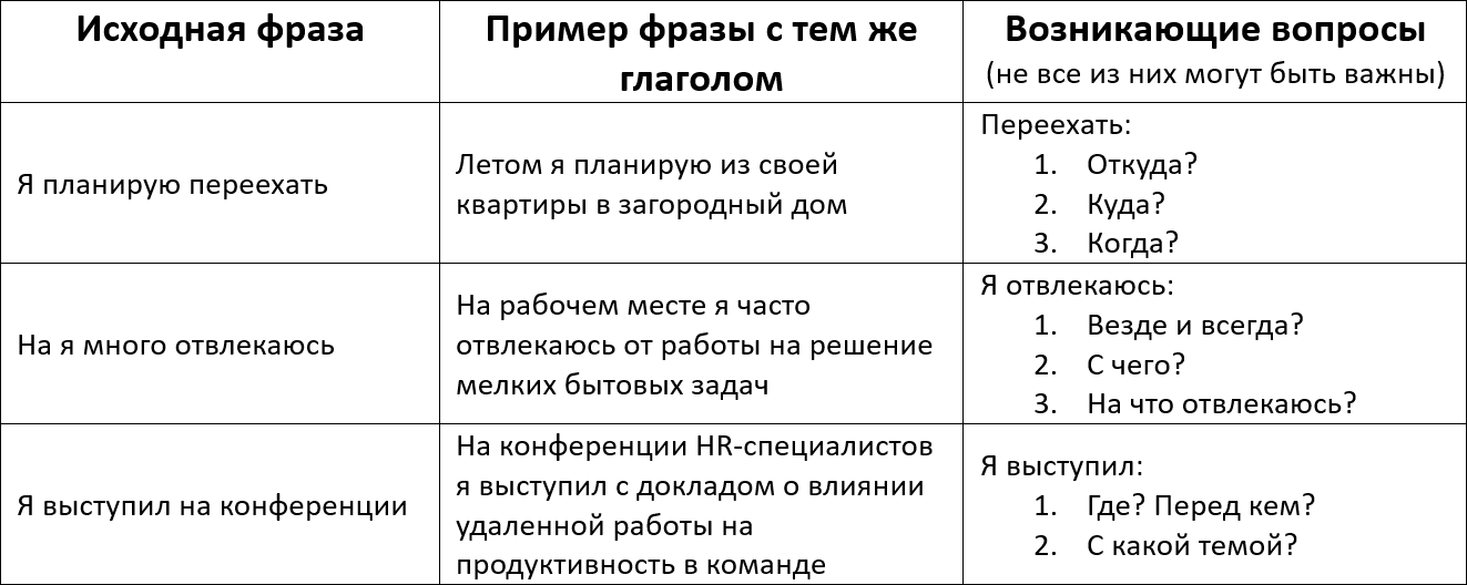 Можете ли вы придумать (или вспомнить) другое грамматически правильное предложение, в котором используется тот же самый глагол, но имелось бы большее число аргументов ? Каждый из аргументов может натолкнуть вас на вопрос, который стоит задать, но не каждый вопрос будет полезен в данном контексте.